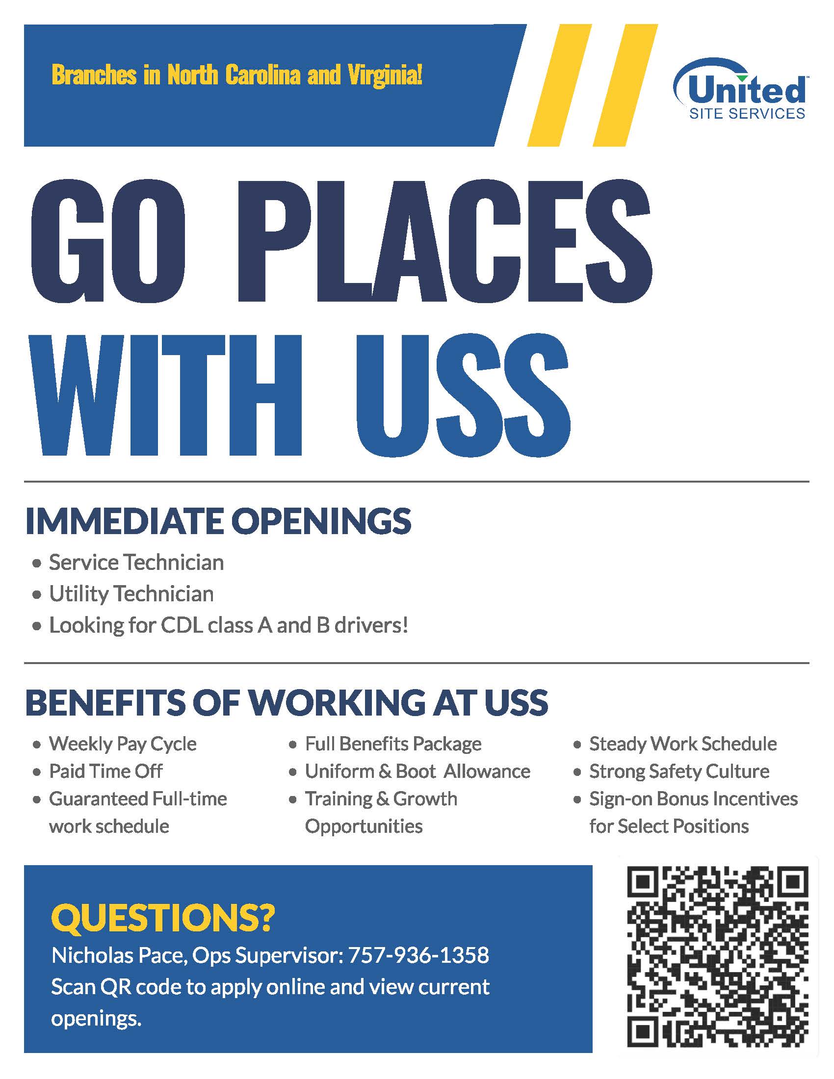 United Site Services (USS) will be onsite conducting same-day interviews and making on-the-spot job offers for qualified candidates. They are hiring for positions across Virginia and North Carolina.
