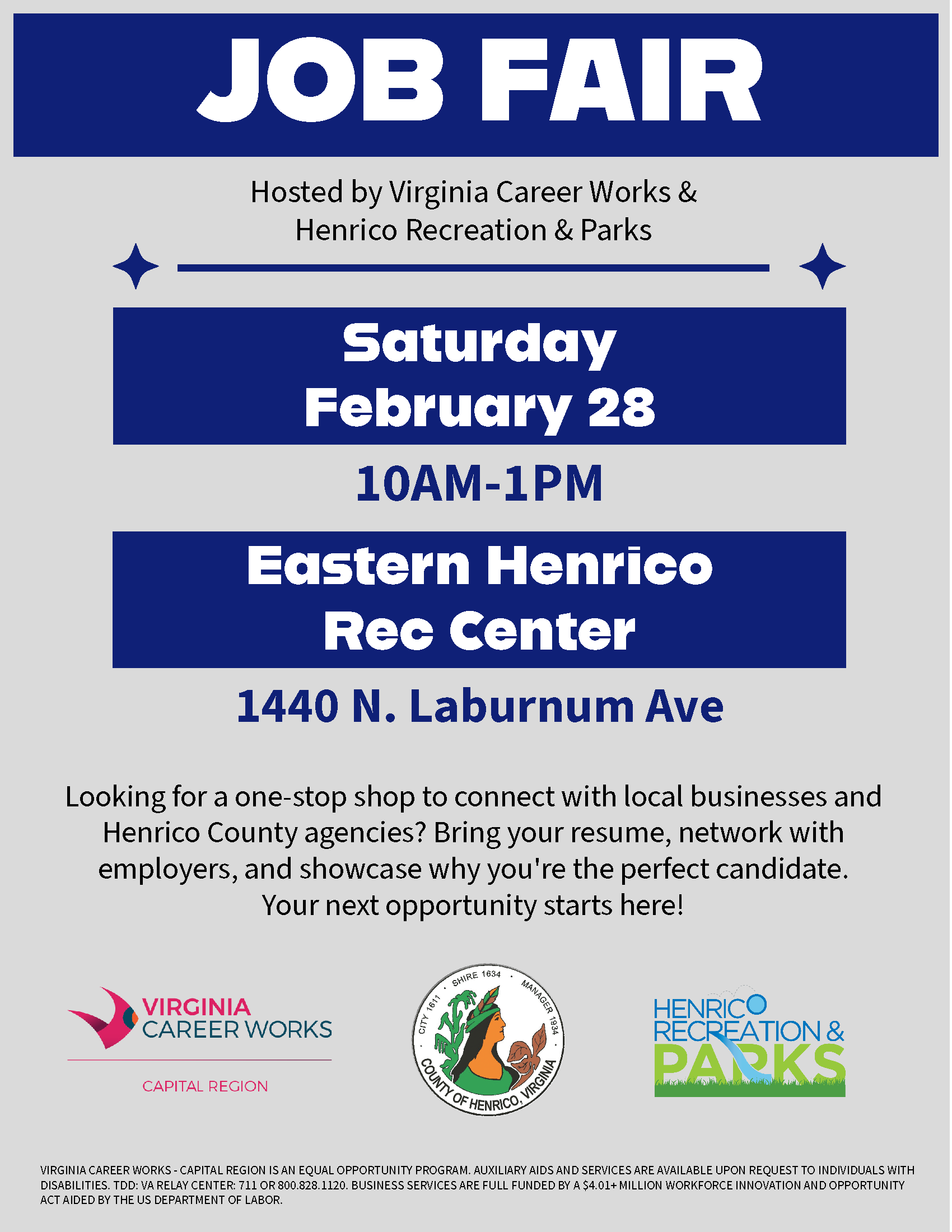 Looking for your next job opportunity? Join Virginia Career Works – Capital Region and Henrico Recreation & Parks for our Regional Career Expo, where job seekers can connect directly with companies that are actively hiring.
