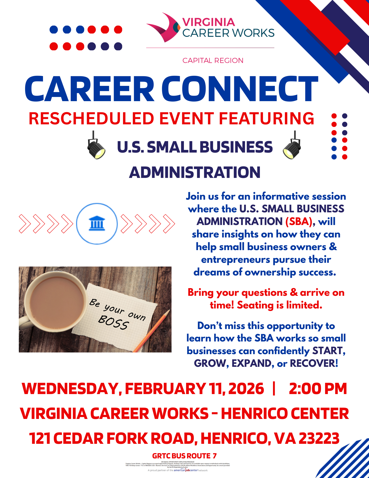 FeaturedVirginia Career Works - Henrico 121 Cedar Fork Road, Henrico, VA, United StatesVirginia Career Works - Capital Region Presents: Career Connect Featuring the U.S. Small Business Administration Are you ready to start your own business or take your small business to the next level in this New Year? Join us for an exclusive session with the U.S. Small Business Administration (SBA) and gain valuable insights, […]